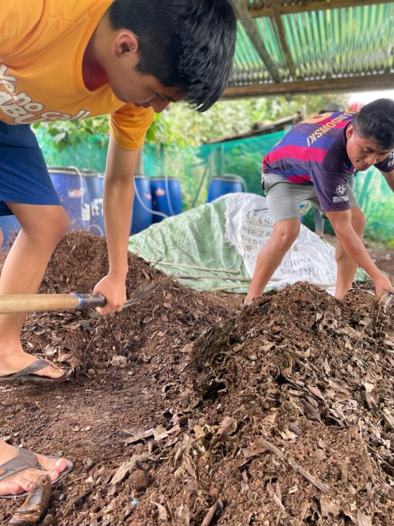 - Biofertilizantes y compostaje: Producimos 20 timbos de biofertilizantes líquidos y una tonelada de compostaje a partir de pulpa de café.